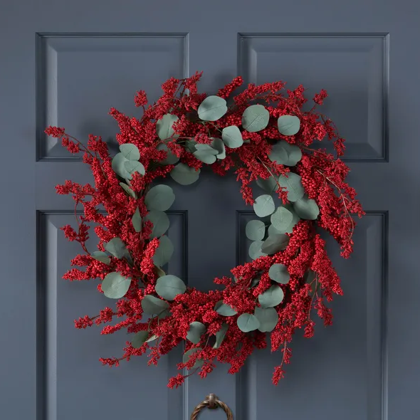 Large Size: The artificial Eucalyptus wreath is 29 in. With individually crafted eucalyptus leaves and red berries, this full bodied wreath as charming as the real. With a little natural elements, made your living environment looks more comfortable and artistic.